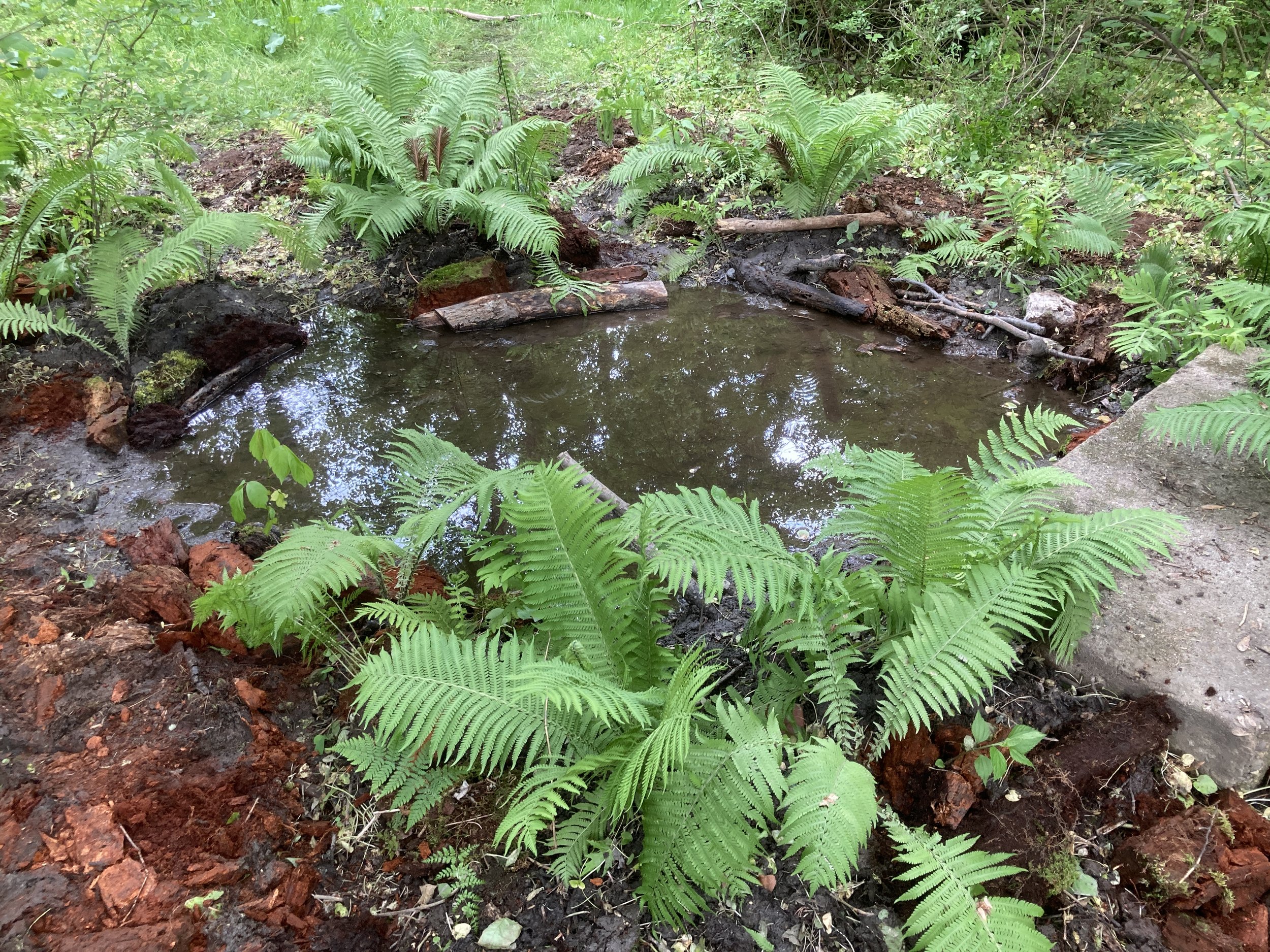 In addition to restoring the woodland and making the space nicer for park goers, we have also installed a small vernal pool to benefit wildlife. We dug this slight pool further back in the woodland area where rainwater naturally collects. While the pool is dry much of the time, it stays mostly full for many days after a rainfall, providing needed water for wildlife. Our pool attracts frogs, salamanders, puddling butterflies, and also acts as a natural drinking source for birds, deer, raccoons, and foxes. We have planted a variety of native wet-loving plants around the pool, including ostrich ferns, sensitive ferns, blue flag iris, and jewelweed, to create an enticing space for nature and wildlife.